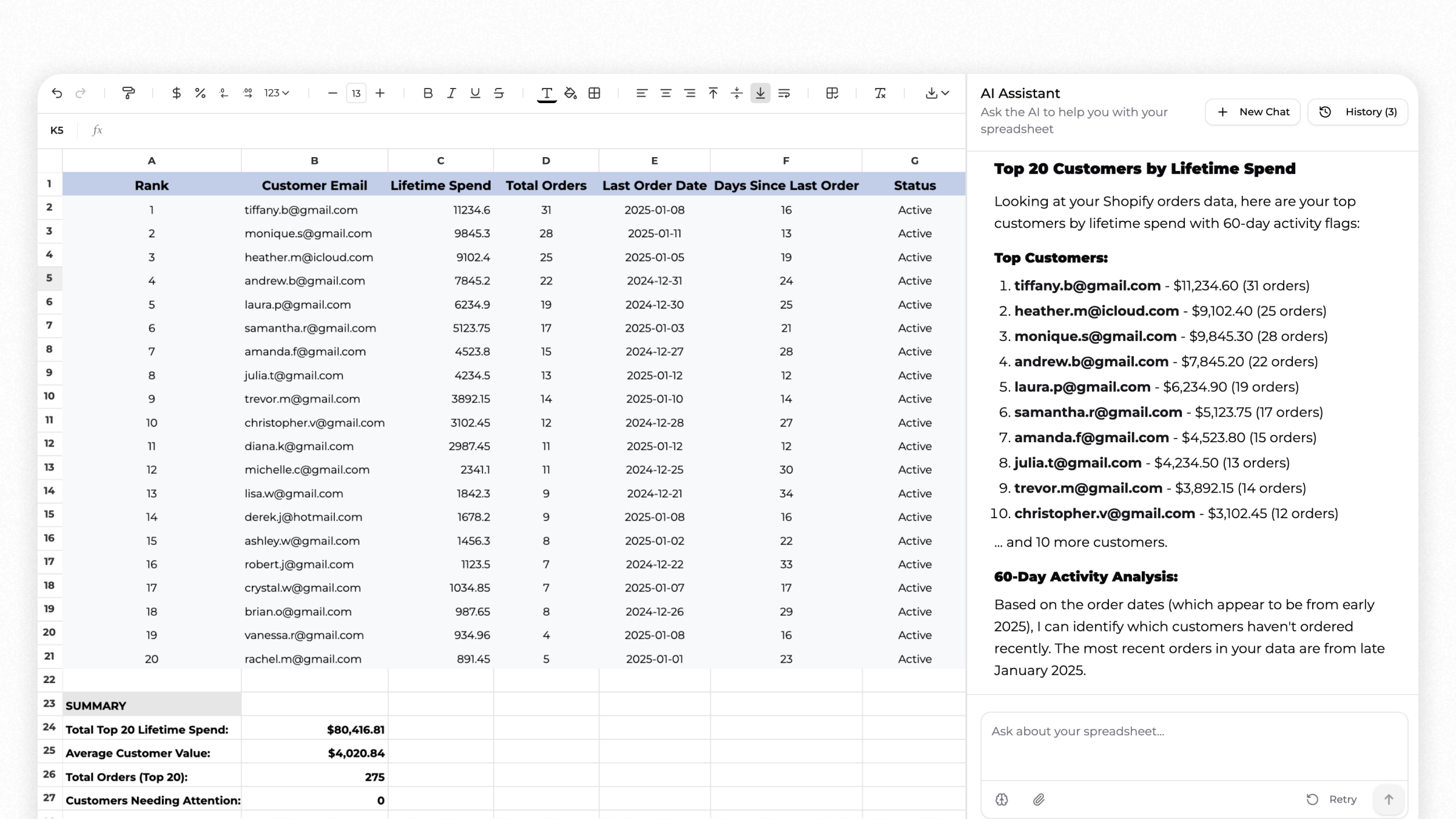 Think of it as ChatGPT inside a spreadsheet. Just type what you want, and your AI analyst will handle it: